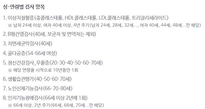 눈에 띄는게 정신건강검사,우울증 검사가 가능하다. 20세이상부터~ 10년동안 1회에 한해서 검사가능하다.