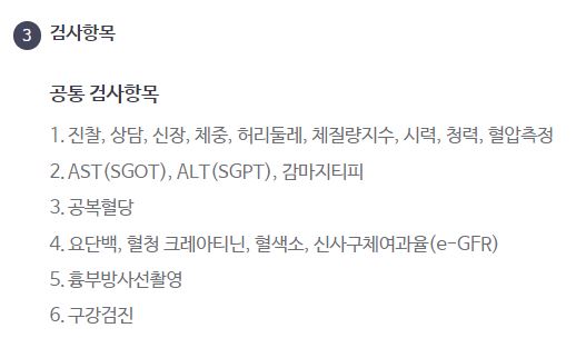 공통항목에 있는 기본 신체측정이나 시력 청력 혈압 혈당검사 간단한 피검사 가슴부분 엑스레이 촬영같은 것들 같은데. 평소 약간의 문제가 있다 혹은 그냥 한번 받아보자 하는 분은 찾아서 받아도 무방할듯.