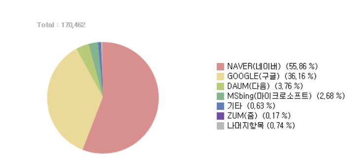 현재 한국의 검색엔진 점유율의 55.86%를 네이버가 차지하고 있습니다.