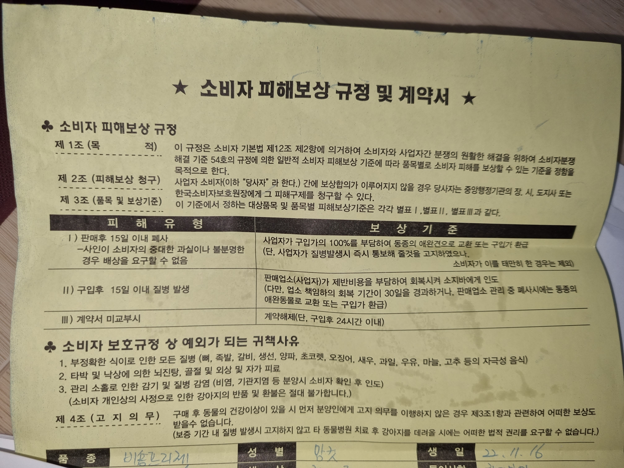 1차 접종 맞은상태고 구입하니 개밥그릇,사료,인식표,계약서 작성등 해서 주시더라구요.