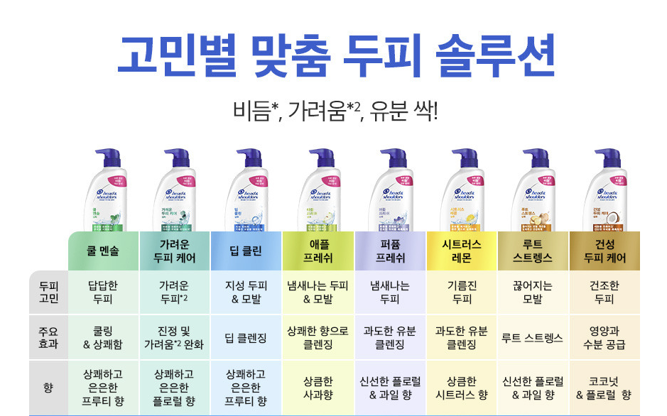 헤드앤숄더는 비듬, 가려움, 냄새, 유분기등 두피 상태별로 다양한 라인이 나와 있어요.