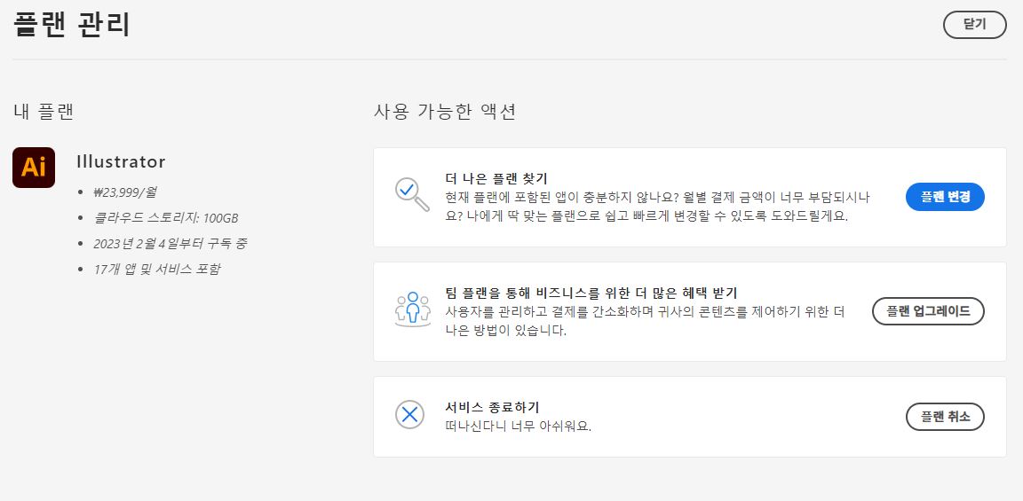 기존에 18000원 결제하고 있던 플랜이라 더 싼건 없어서 오히려 금액 업해서 새로운 플랜 24000원짜리 일러스트레이터 연간 플랜으로 갈아탐!