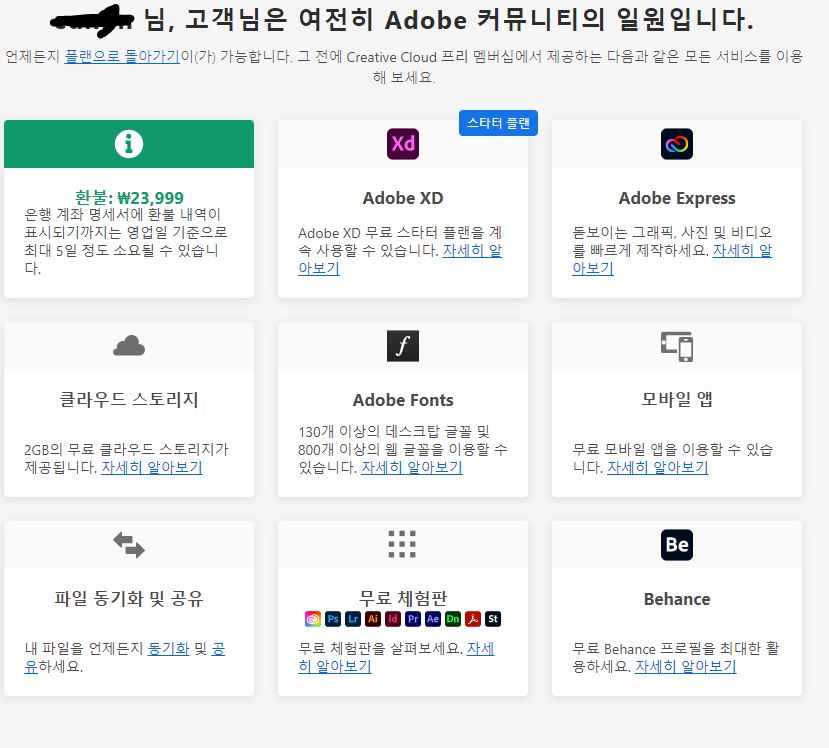 바로 크리에이티브 클라우드로 들어가면 내플랜이 바로 바껴있고