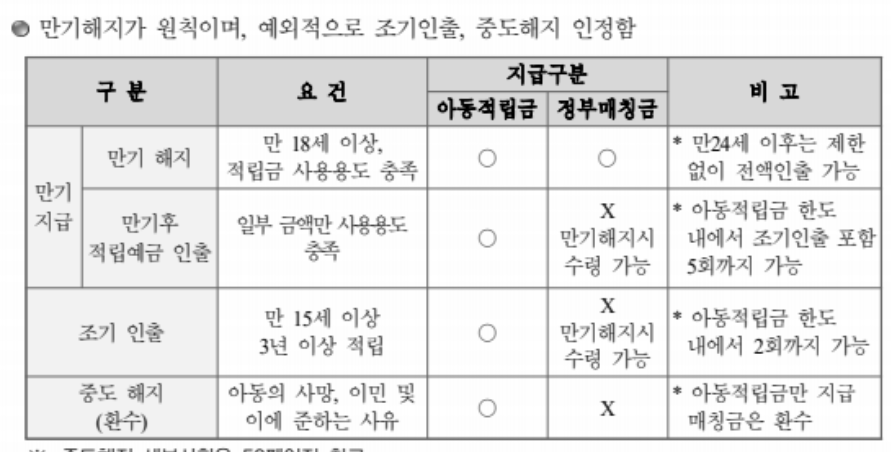 * 향후 만 24세 도달시 자동으로 본인 명의 계좌로 인출되는 시스템 구축 예정. 이를 위해 만 18세 경과 시 협력은행 계좌 개설 안내 필요. 업무 절차는 추후 별도 안내