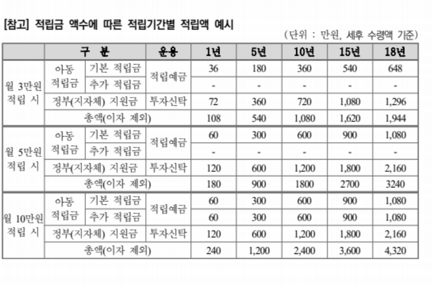 - 아동이 후원자 또는 보호자의 도움 등으로 적립 시 월 5만원 내의 범위에서 1대 2로 매칭하여 국가가 월 10만원 내로 지원